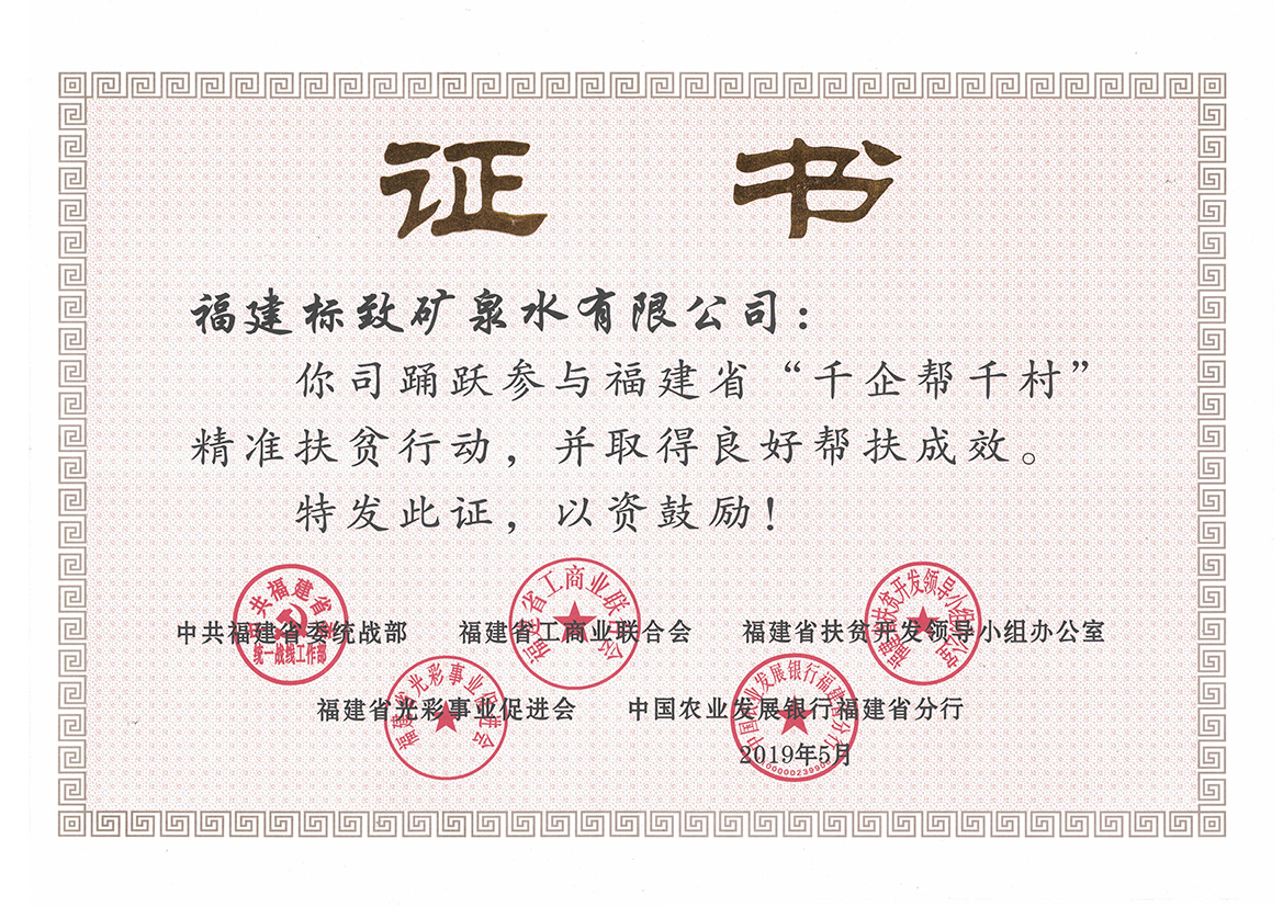 • 2020-05-132019年5月,標(biāo)致公司榮獲“踴躍參與福建省‘千企幫千村’精準(zhǔn)扶貧行動(dòng),并取得良好幫扶成效”的榮譽(yù)證書(shū)。